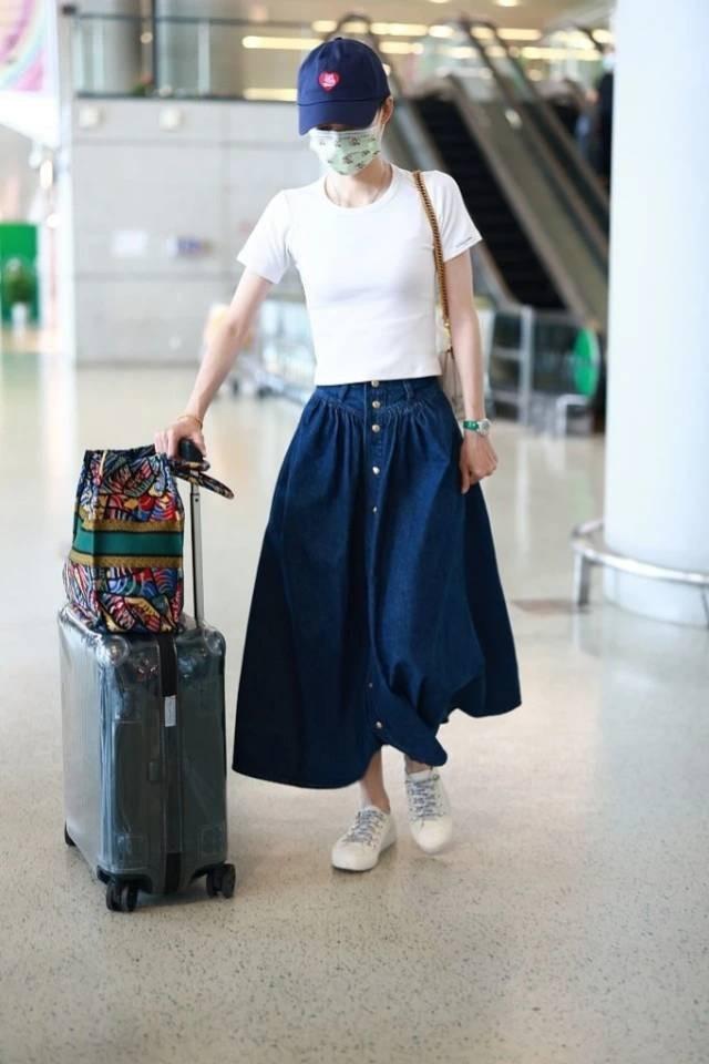 First of all, Wang Likun chose a relatively slim-fitting white T-shirt to concave the curve of his upper body, fully demonstrating the advantages of his figure and achieving a slimming effect. The denim skirt not only has a long design, but also has a looser version that is casual and natural. It contrasts with the slim top and highlights the slim waist effect.