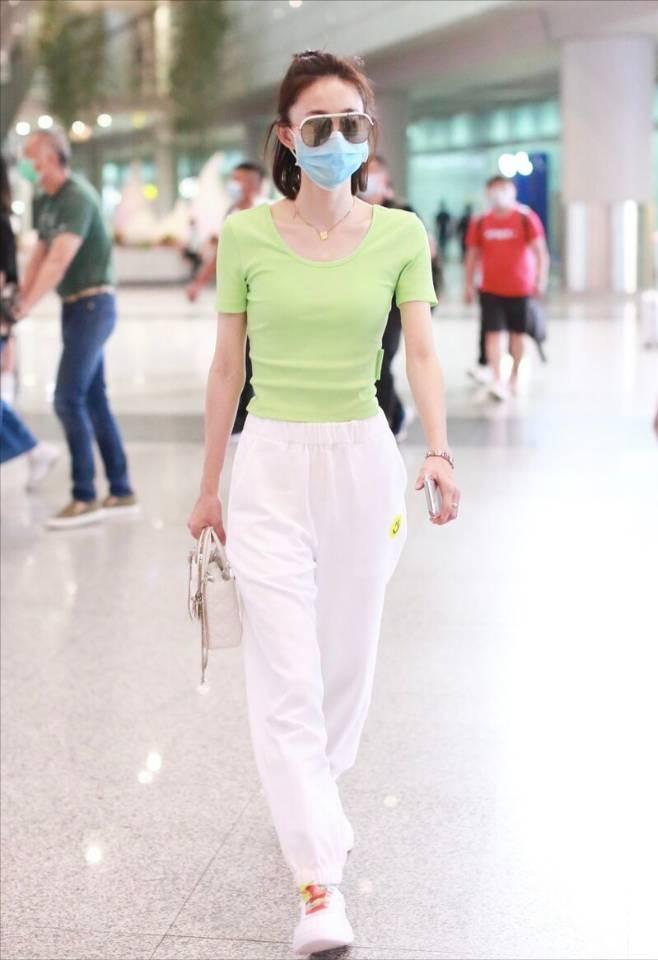 Summer is different from other seasons. You can be more adventurous when choosing a match, so there are naturally many choices in color for slim-fitting T-shirts. Wang Likun chose a dazzling pure green color scheme and paired it with a pair of white sweatpants, making the overall outfit simple and eye-catching. This outfit is quite suitable for street style girls to imitate.
