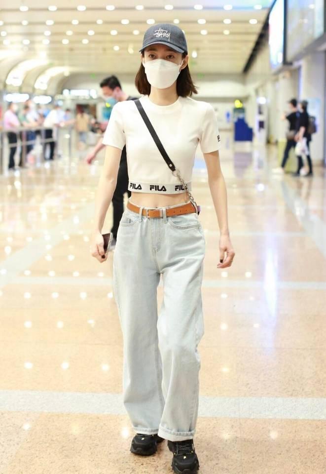 If you want to make the overall match more personalized, you can choose a slim-fitting T-shirt to show off your body curves like Wang Likun did.The umbilical design makes matching more discreet. The slim-fitting top can also be paired with the most popular dad pants, which will greatly enhance your cool temperament!