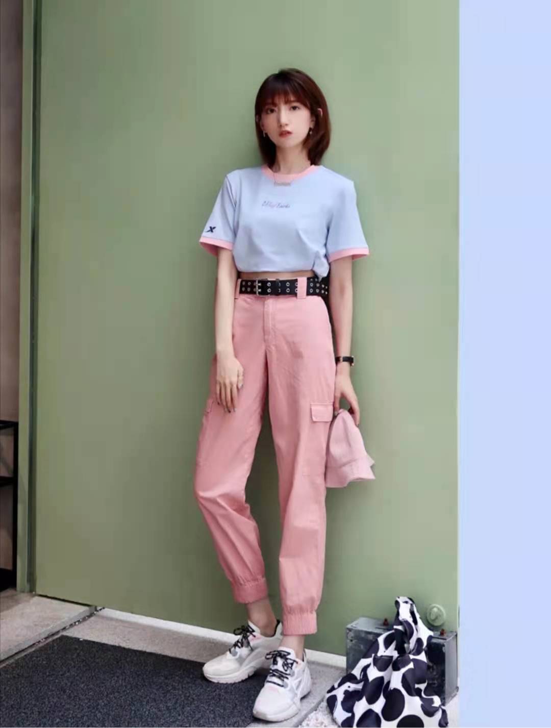 The milk blue T-shirt is simply eye-catching and paired with a pair of pink overalls. The T-shirt can be rolled up and worn into a short top. Paired with high-waisted pants, it is cool and sweet. There are many colors of T-shirts, so choose Wear a flirty pink blue and add a black belt to the pants to match the black on the shoes and bag.