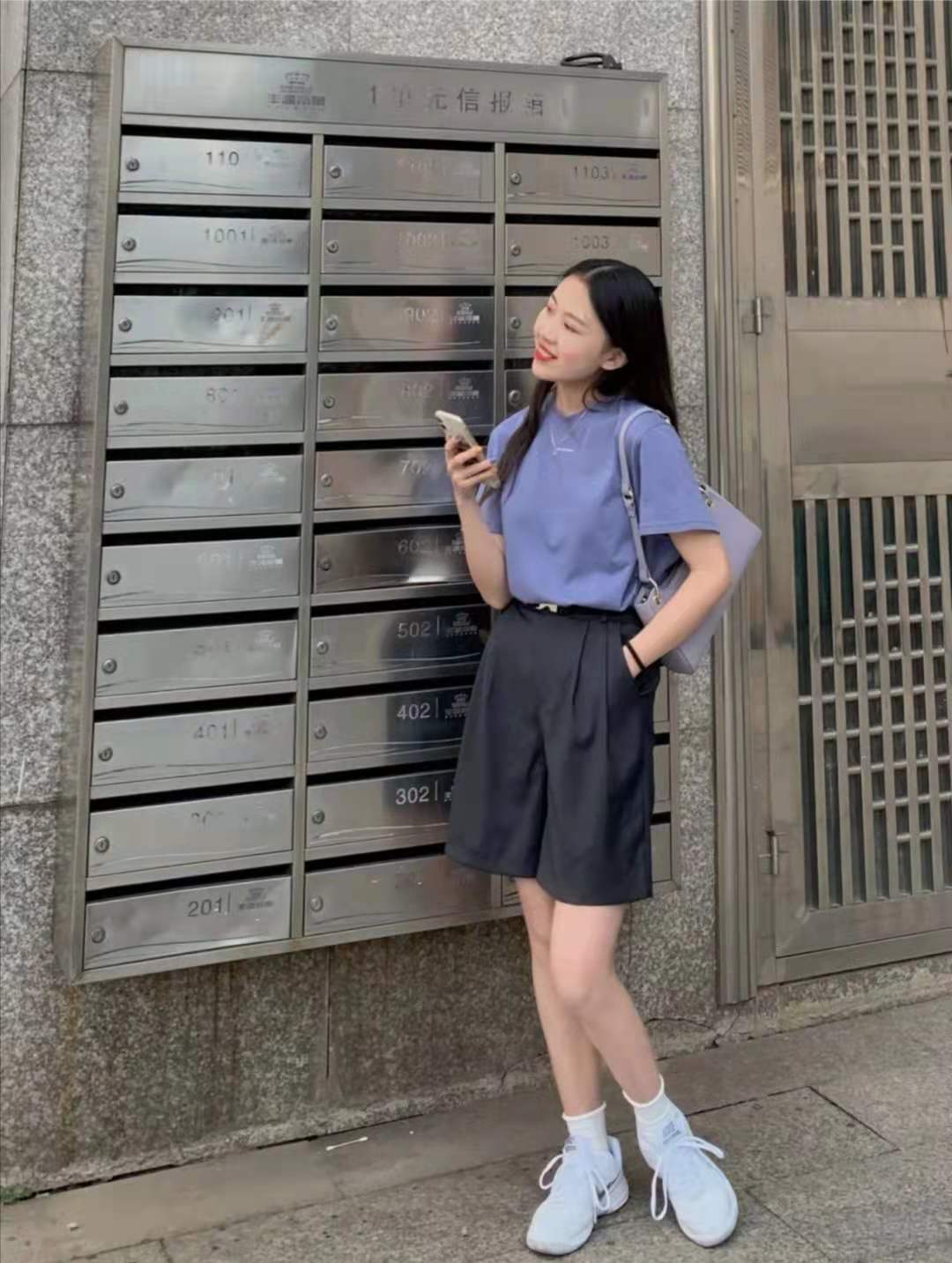 If you want shorts that look stylish and look taller and slimmer in the summer, they are mid-length shorts with small wide legs, which are super fat-hiding. , and the pattern is also super positive, very three-dimensional, sweet and cool, the dark gray is also very eye-catching, paired with a blue-purple T-shirt, the color is also super special, the whole set looks very good Comfortable.