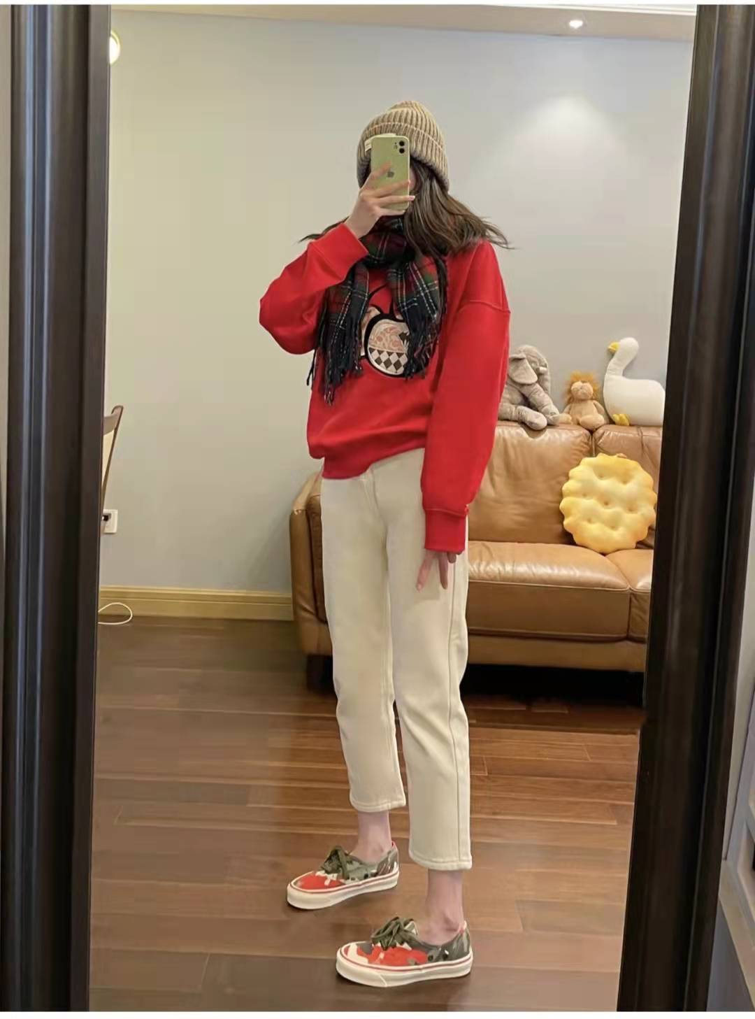 Red sweatshirt matching:The color of the red sweatshirt is perfect for the New Year! The cookie pattern is super cute, the sweater is of good texture and comfortable to wear, and it can be worn alone or as an inner layer. Wearing a white turtleneck base, a white skirt on the lower body, white socks and bright canvas shoes on the feet, this outfit is very suitable for the early spring season.