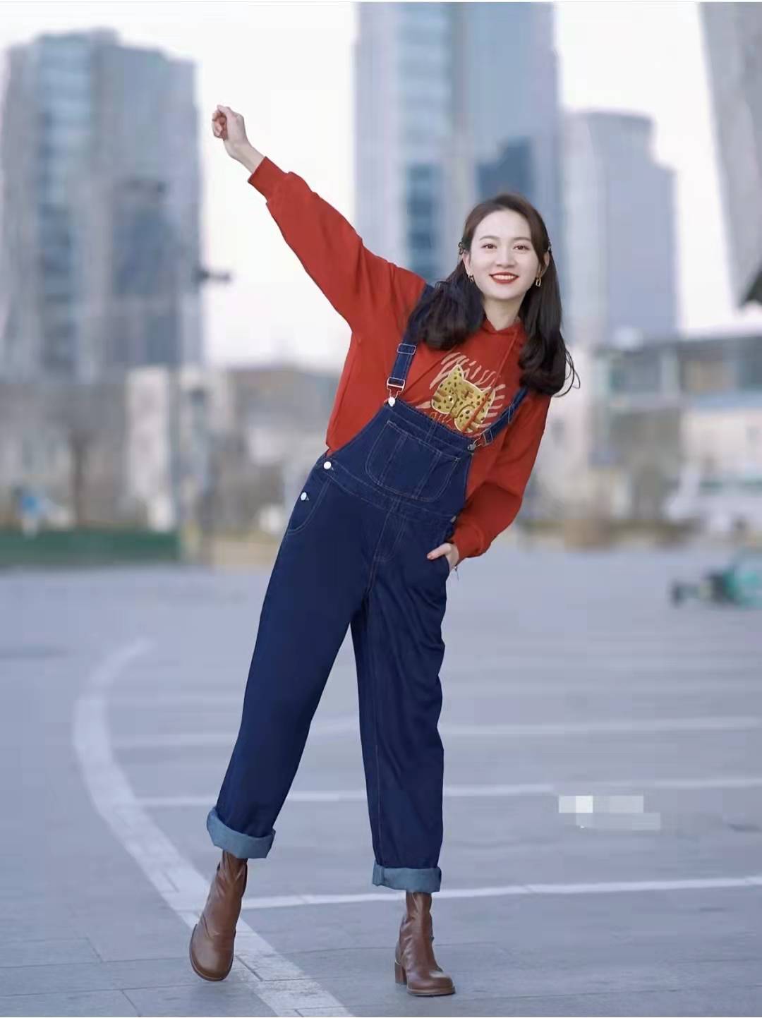 Red sweatshirt matching:Of course red embellishment is indispensable for festive atmosphere wear. Xinru’s cute tiger series embroidered sweatshirts are cute and satisfy the hearts of girls. Red is a favorite fashionable item, paired with dark colors Overalls reduce age yyds and make a young lady full of energy.