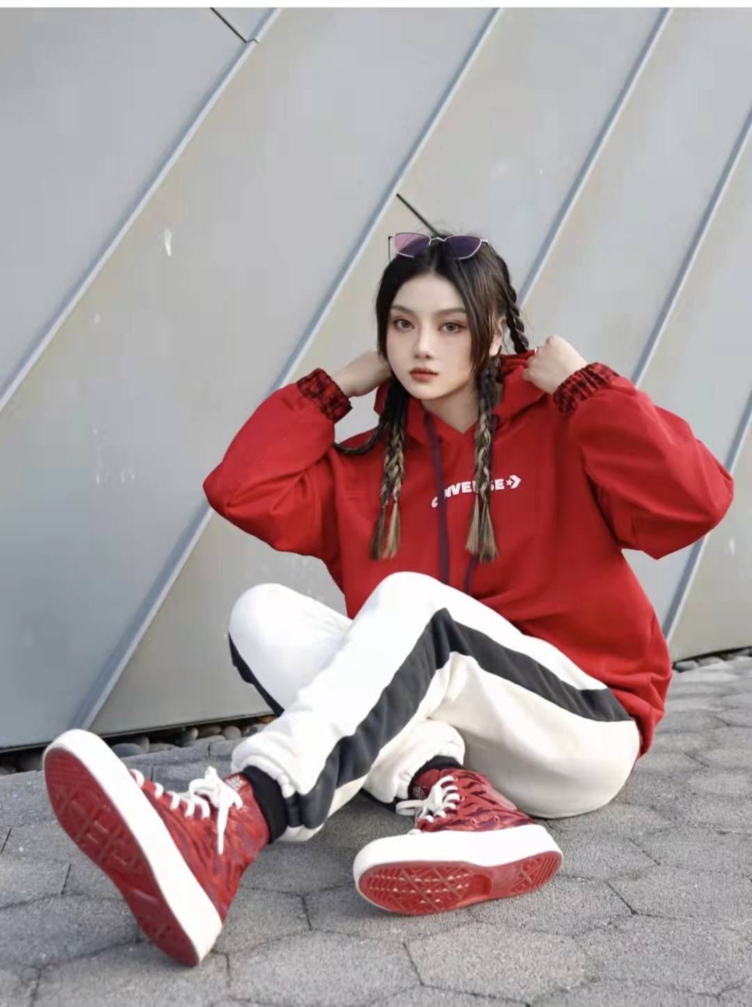 look8 red sweatshirt + white wide-leg pants + white shoes