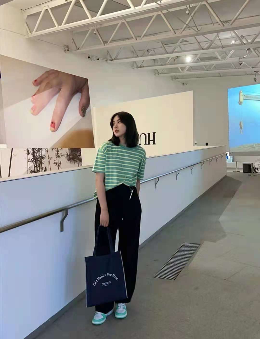 Striped T-shirt with pants: Light green striped short-sleeves are refreshing and clean. They are great for casual matching. They are comfortable and good-looking for daily outings. The lower body is worn with black straight-leg trousers, which is the perfect way to wear it for lazy people. When wearing this, be careful to wear a simple and cool necklace. It is trendy and niche, which is a plus. The bag is paired with a lettered denim bag, which is retro and casual.