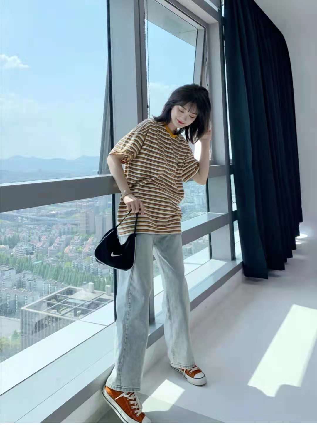 Striped T-shirt with pants: The yellow striped T-shirt looks so youthful. Striped T-shirts are a versatile item. The stripes themselves make you look slimmer. The loose, dropped shoulders are natural and easy to wear. The yellow color also has a summer feel. Pair with a pair of light-colored straight jeans. Another pair of canvas in the same colorThe shoe echoes up and down. The whole person’s matching is very coordinated and natural. It looks like it can be worn casually but looks the most eye-catching.