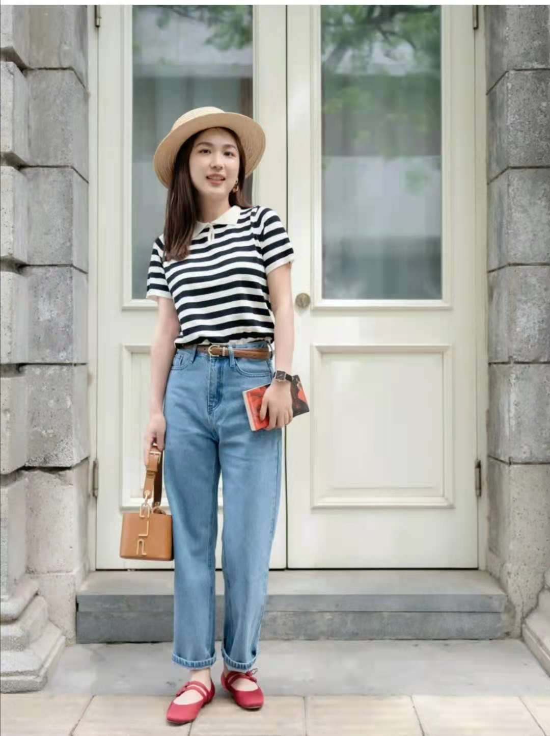 Striped T-shirt with pants: an easy-to-get daily miscellaneous outfit, a red and white or black and white striped shirt, paired with retro jeans, simple and casual, you can wear it with your besties. Each has its own characteristics and has a full sense of CP! Regardless of the length of jeans, it is recommended to choose high-waisted styles to show off your proportions!