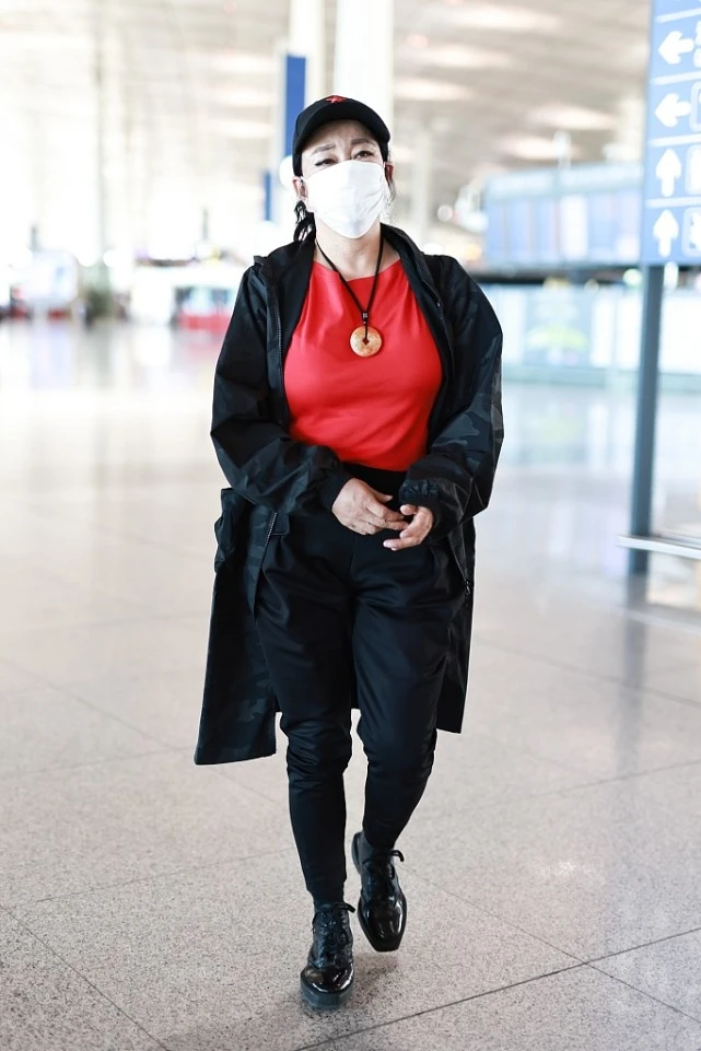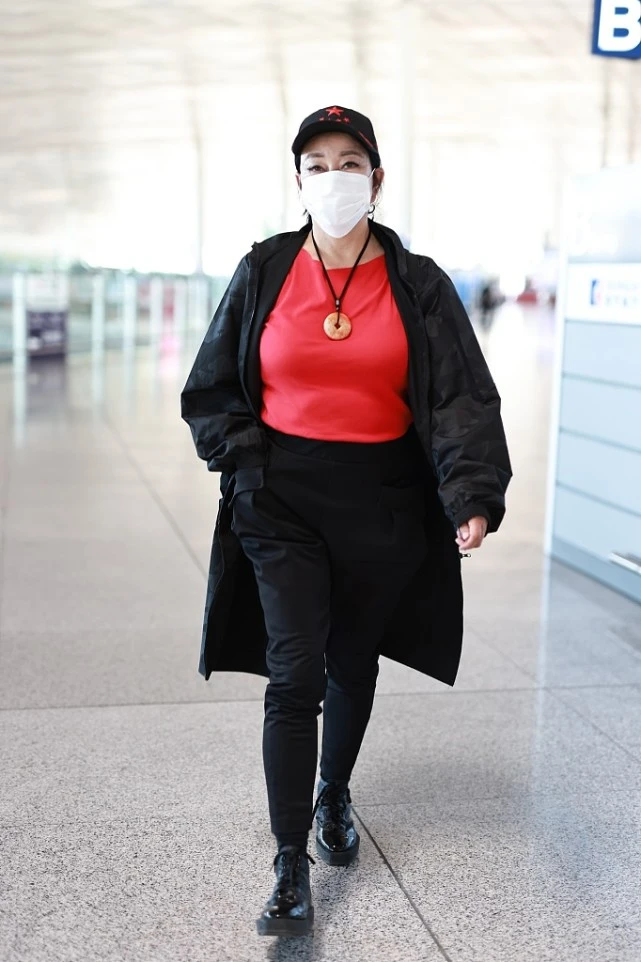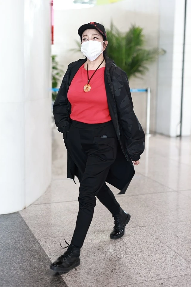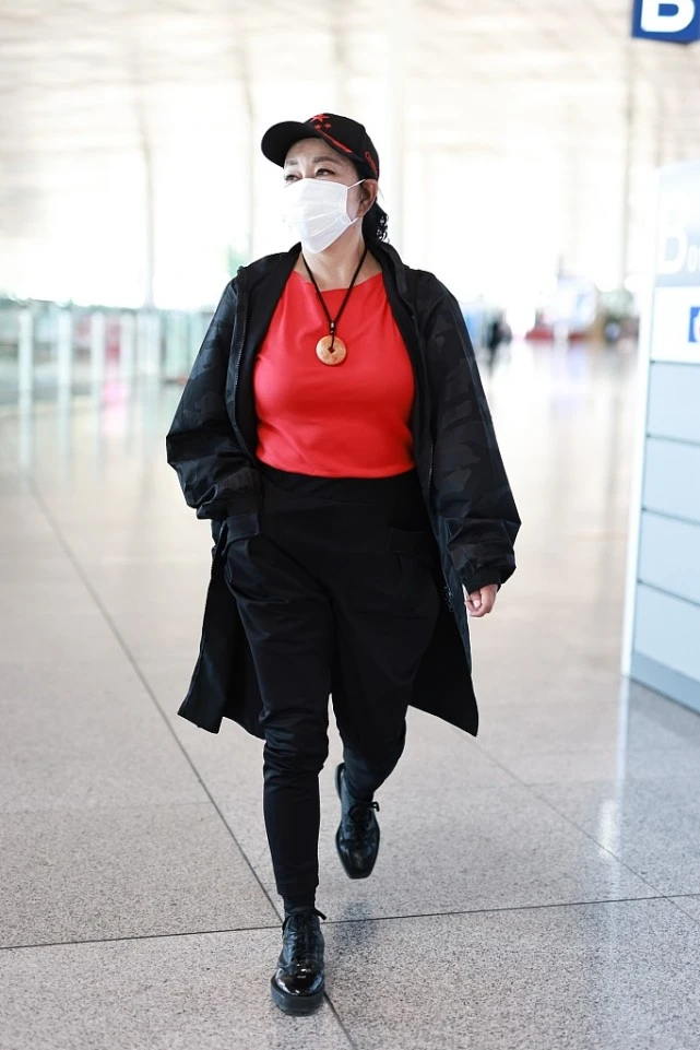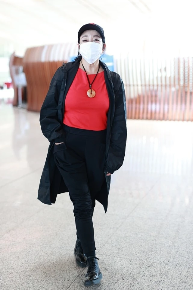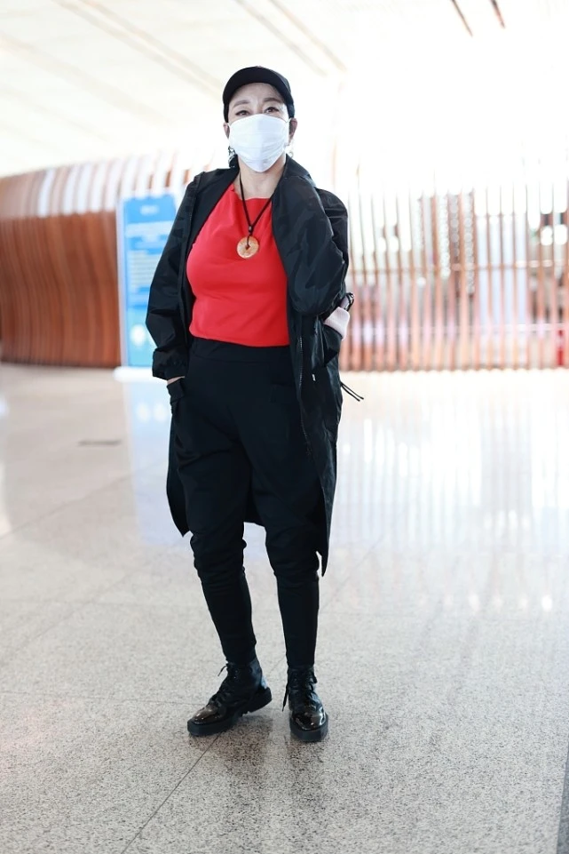 Liu Xiaoqing likes bright colors very much. For example, bright red inner wear is very eye-catching. Paired with black pants, it is very fashionable. Wearing Martin boots looks both younger and more fashionable. Even though she is no longer young, she still looks confident in her outfit.