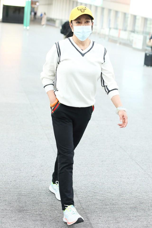 A simple white T-shirt is added with a pattern design to increase the age-reducing effect , paired with leg-tight sports pants, it will be more youthful and energetic. The simple black and white combination is fashionable and versatile, and can be easily matched to give a sense of high-end elegance. Tie a loose white T into the trousers to highlight the waistline and heighten the height at the same time. , the sweatpants with a cuffed design are very youthful and age-reducing. When paired with white dad shoes, Liu Xiaoqing doesn’t want to look 66 years old.