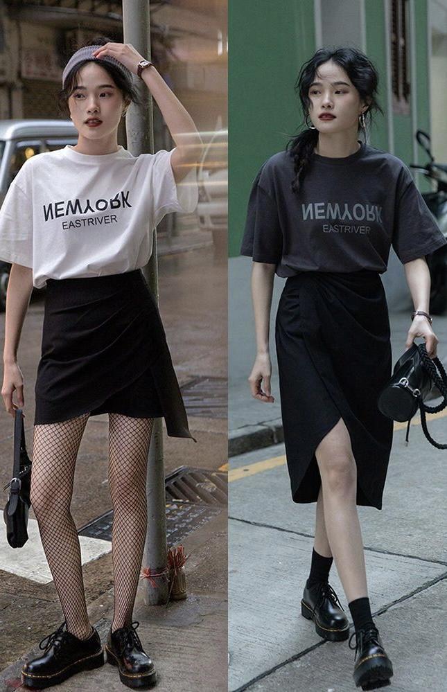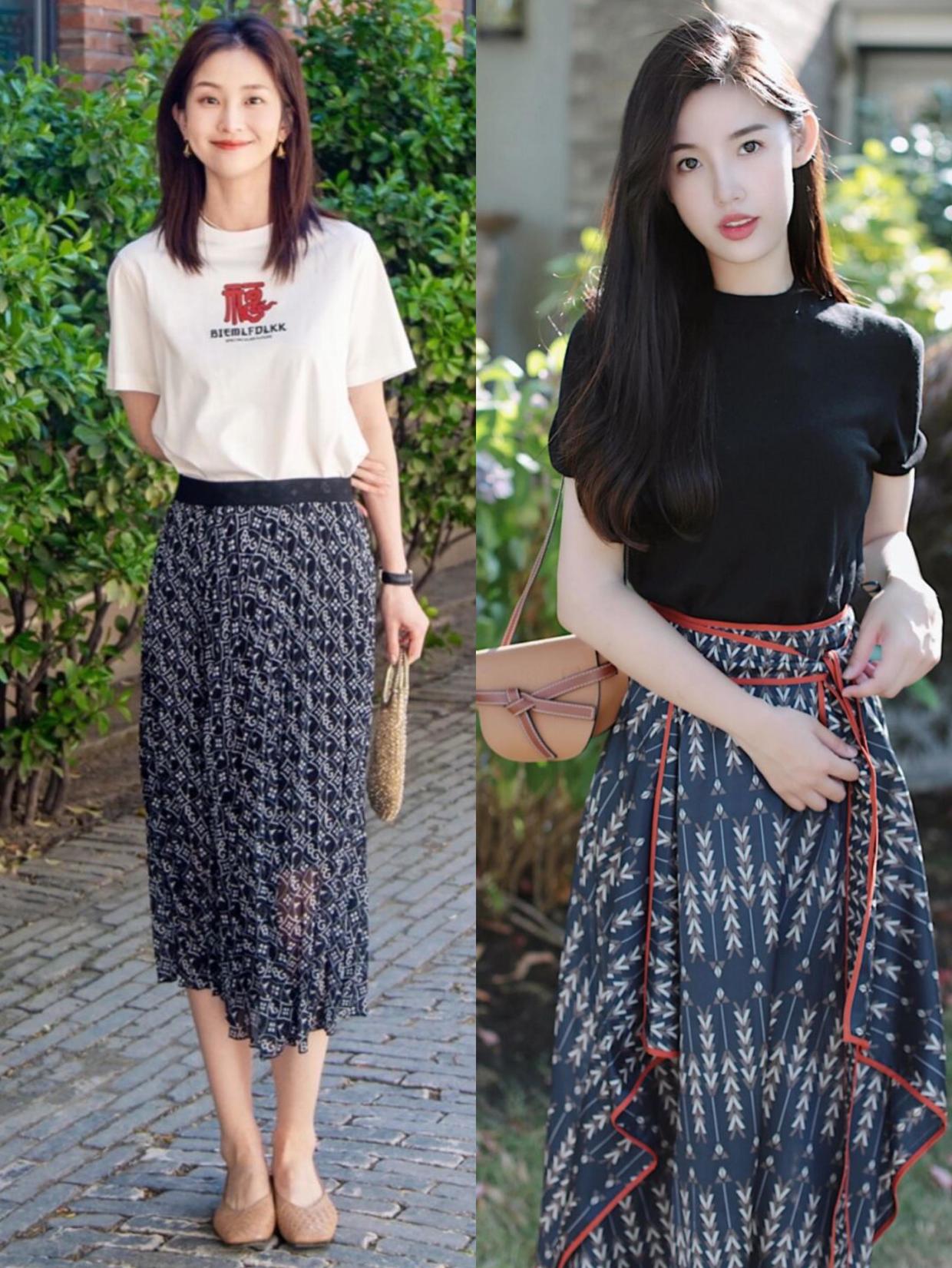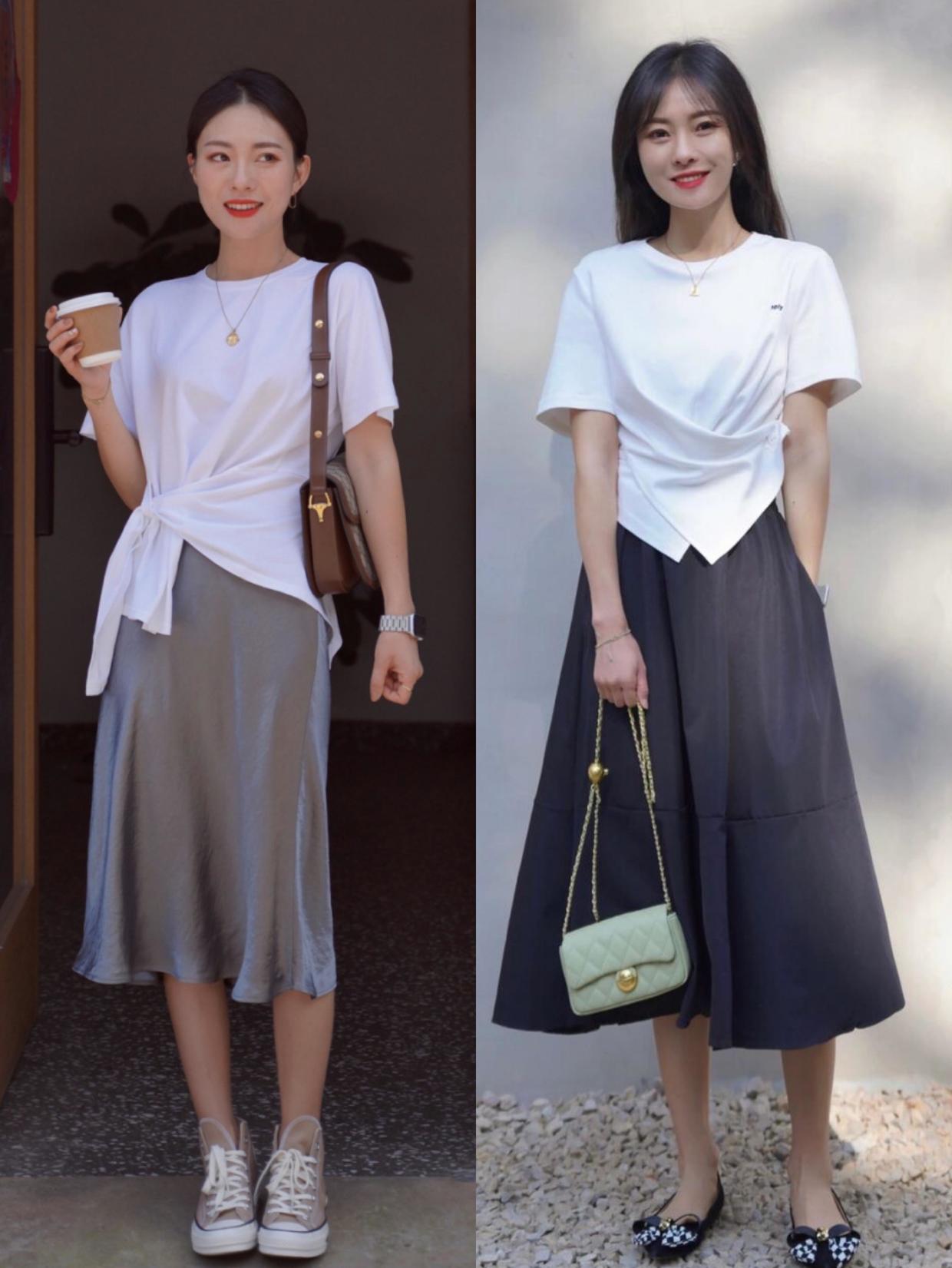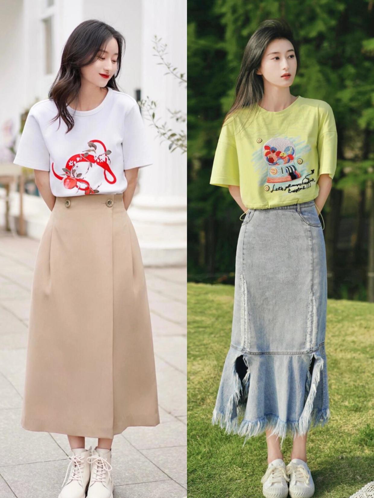 If the color of the T-shirt is relatively ordinary and does not incorporate special printing as embellishment, you can choose a printed skirt that you like on the lower body to enrich the color and elements of the look. It is recommended that you try to choose a skirt with a more obvious waist-cinching effect, or choose an additional belt to wear around the waist, which can better show off the concave and convex figure.