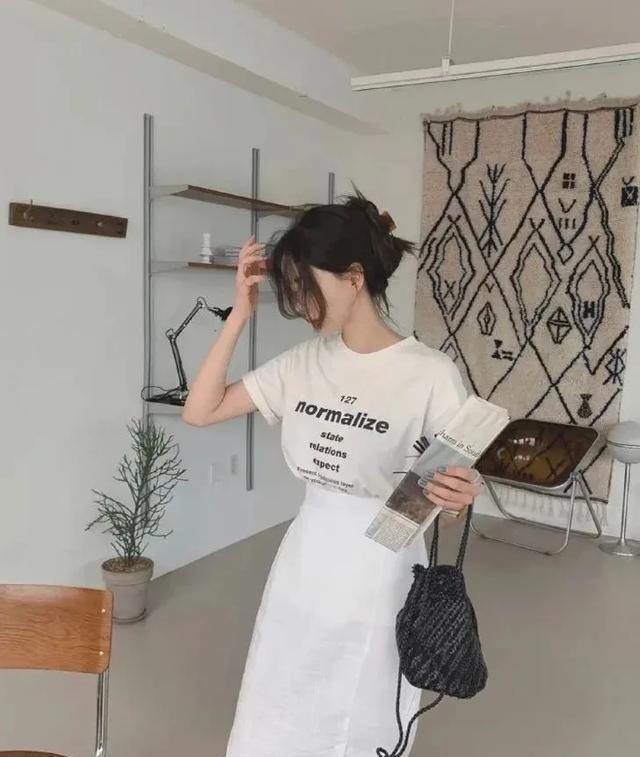 For those who like elegant lady style and want to create a sense of luxury Girls, you can try the matching method of the same color. A milky white T-shirt with letters printed on it. The lower body is matched with a more pure white high-waisted skirt. Matched with the Korean-style hair style, the whole look Look elegant and dignified.