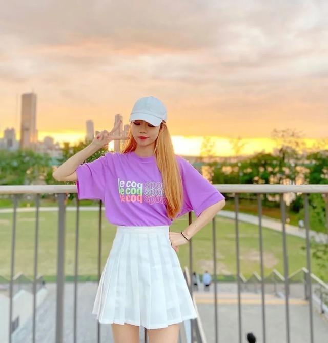 In fact, it is similar to the long bust Compared with skirts, short pleated skirts can create a more playful and sweet style. The upper body is a purple T-shirt with printed elements, and the lower body is a white pleated skirt. The color combination The combination of traditional and simple is used to make the figure look slimmer, while the color matching is fresh and fashionable.