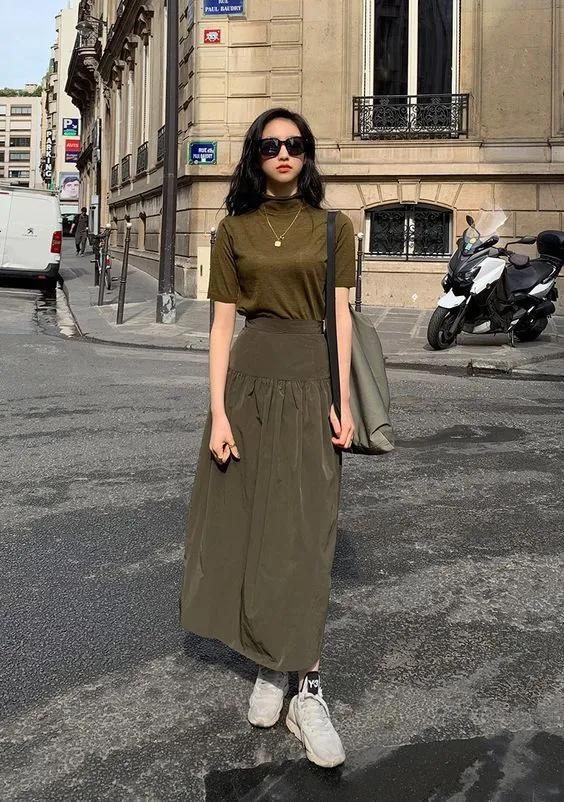 If the T-shirts and skirts you choose are loose, they will look a bit sloppy,If you want the overall look to be neater, follow the principle of combining elasticity and tightness when matchingand pay attention to the overall coordination of the upper and lower parts, which can highlight the unevenness of a woman’s figure.