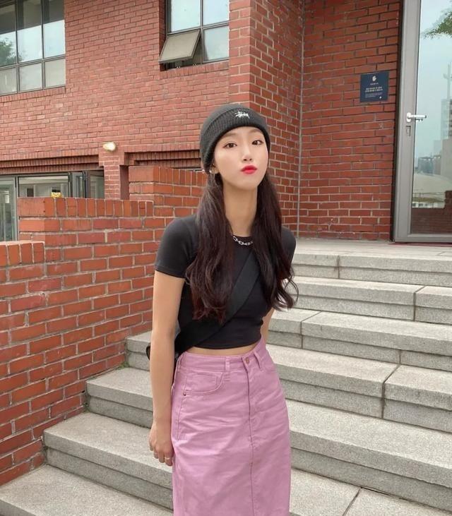 This is a style that most young girls prefer. It can create a sweet and playful feeling and is very fashionable. Choose a round-neck black tight-fitting T-shirt, and pair the lower body with a nude pink skirt. There is a certain amount of white space between the clothes and the skirt, which makes it look more fashionable.