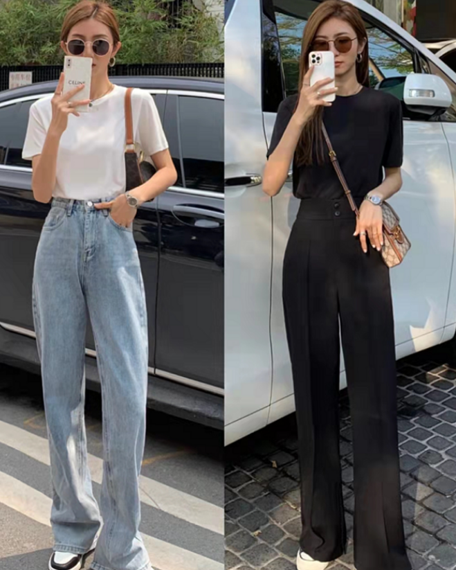 Because when we choose a lazy T-shirt, we choose a fitted version, so it can be worn with high-waisted black pants or jeans. To create a tight-fitting look and enhance the waist line, even girls with apple-shaped or pear-shaped figures can wear it this way.
