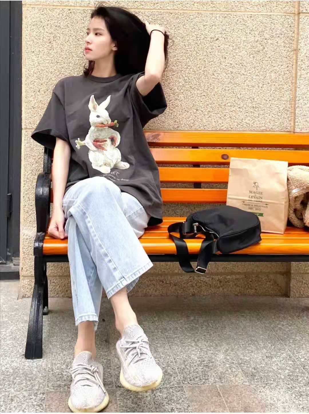 Jeans and T-shirt outfit: This outfit is casual in summer. The print on this T-shirt is very cute, with a pattern of a bunny eating a carrot. The dark gray color is high-end and comfortable. The lower body is paired with light blue denim. Wide-leg pants + shoddy-feeling coconut shoes, a casual outfit that makes it easy to go out.