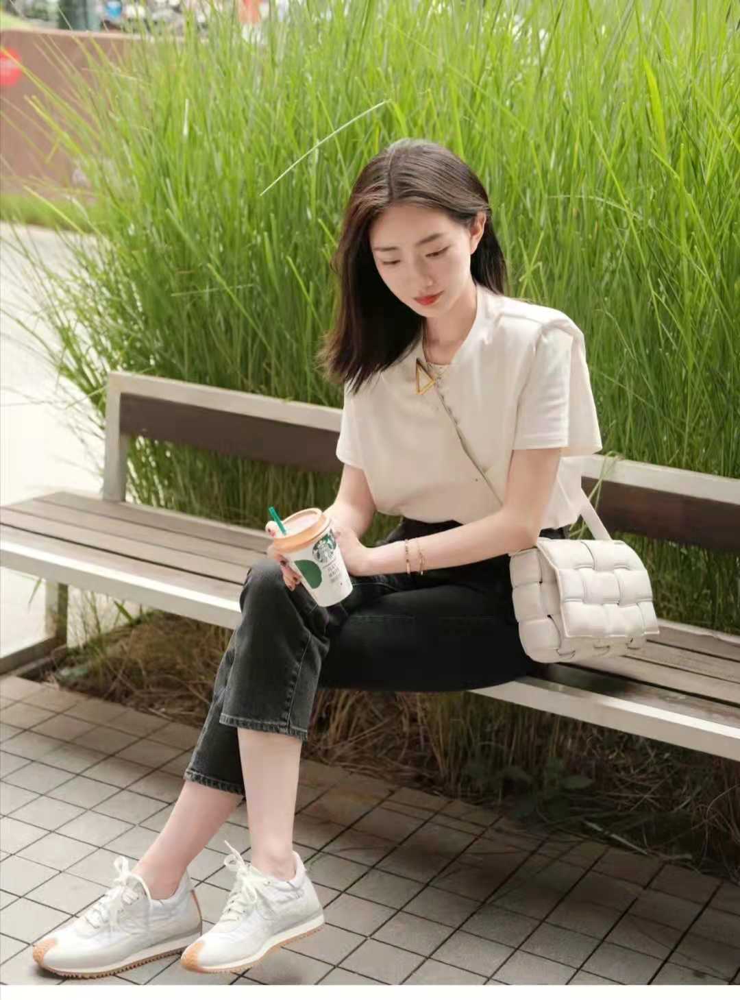 Jeans and T-shirt wear: Pair a white shoulder-padded T-shirt with dark gray jeans. The shoulder-padded version can make the original simple short-sleeve style full of aura and beauty, and it can also make the whole person look energetic. The lower body rotates with nine-point jeans, and light-colored sneakers match the top.