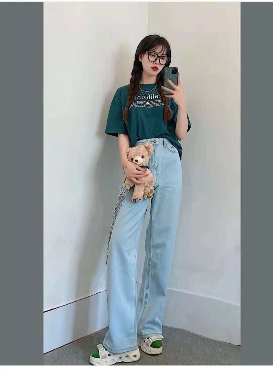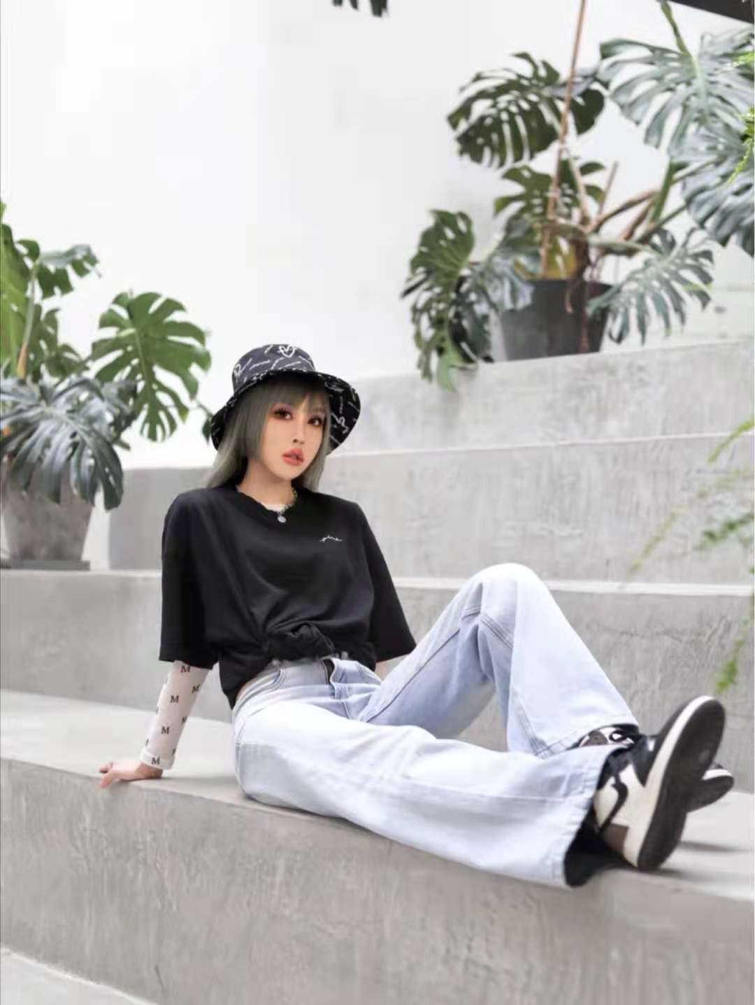 Jeans and T-shirt outfit: This outfit is the simplest T-shirt and jeans, classic, good-looking and not unattractive. The foam words on the T-shirt are the highlight. The black is basic and versatile, and there is also a light blue straight leg. Jeans are so straight-legged, the color is beautiful, the shape of the pants is amazing, and the price is not high, which is great value for money!