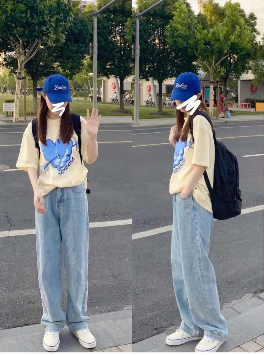 Jeans and T-shirt wear: This outfit has a casual feel. The top is a super tender light yellow love heart T-shirt. The loose cotton version is comfortable and has a sense of laziness on the upper body. The lower body is matched with light Wearing blue slimming denim trousers, Vance green canvas shoes, and a blue peaked cap, this outfit is both Korean and casual.