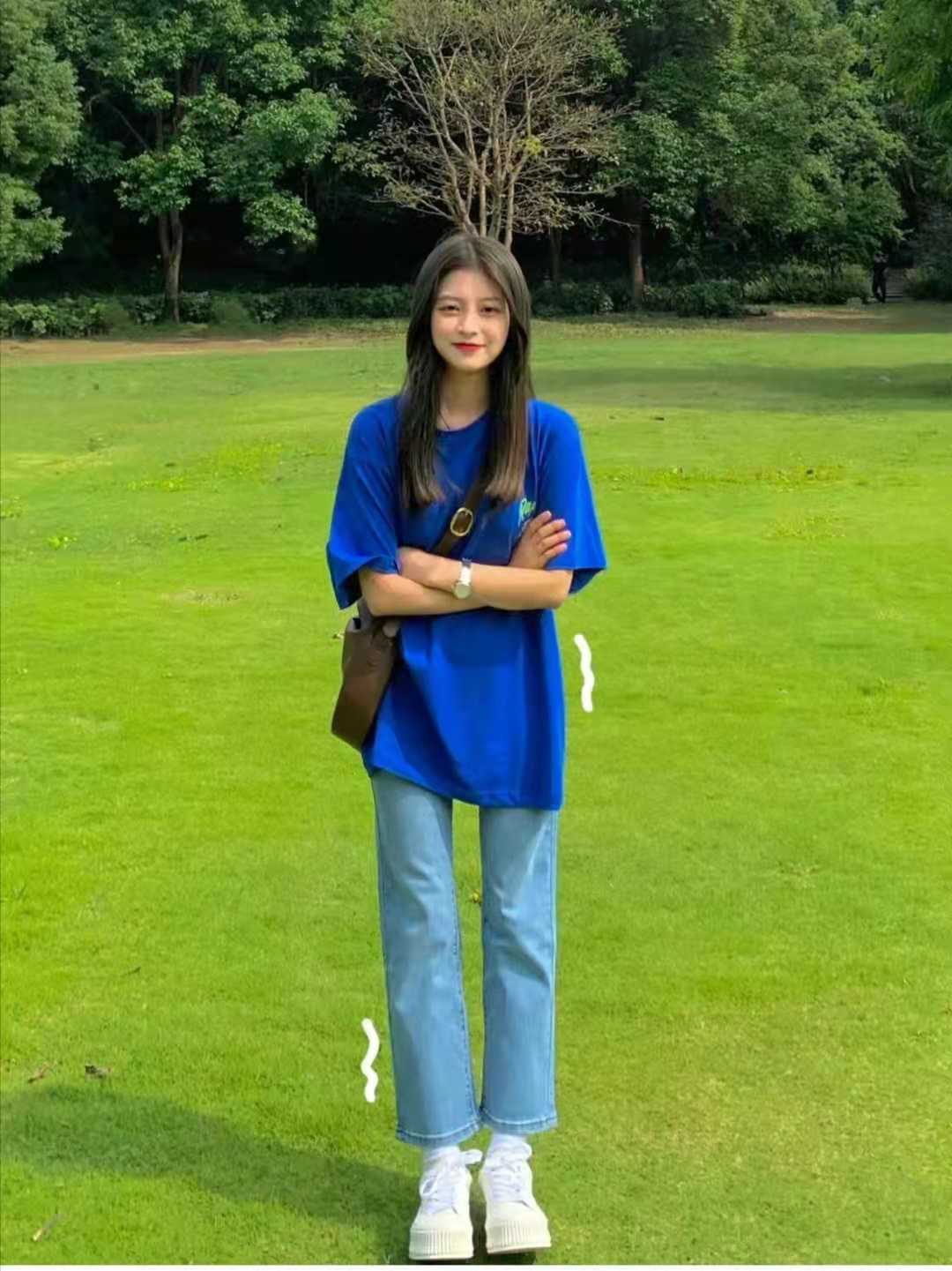 Jeans and T-shirt outfit: This outfit looks taller and slimmer. The top is a loose-fitting blue T-shirt, and the lower body is paired with light blue small straight-leg nine-point jeans. Jeans The version is a relatively slim-fitting style. The top is loose and the bottom is tight. It looks taller and slimmer and is very friendly to small people.