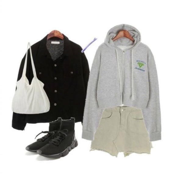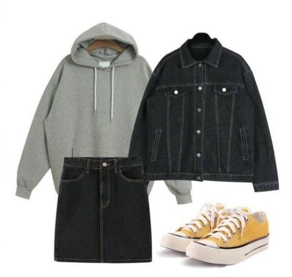 It is still a gray sweater with a black jacket, but our skirt has become a black denim skirt, so the whole outfit will look dull. Therefore, when matching, I added a yellow canvas shoe to brighten the entire outfit and bring the focus. At the same time, it can also make the entire outfit have a very high return rate and add fashion and layering.