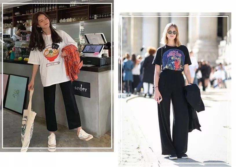 In summer, it is very suitable to wear a pair of wide-leg pants made of chiffon material, which is cool and covers the flesh. You can choose the color of the T-shirt at will. Of course, the most slimming one is black~