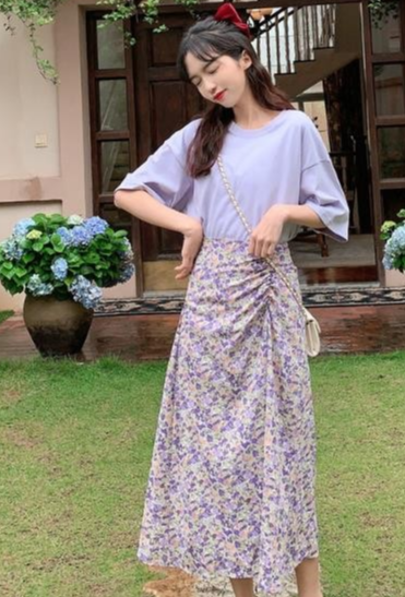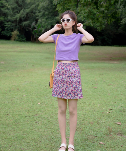 The combination of a solid color T-shirt and a short skirt is really a perfect match for summer. The solid color short sleeves can be paired with a printed floral skirt. The overall style is fashionable and individual, perfect for taking photos. It will also look great.