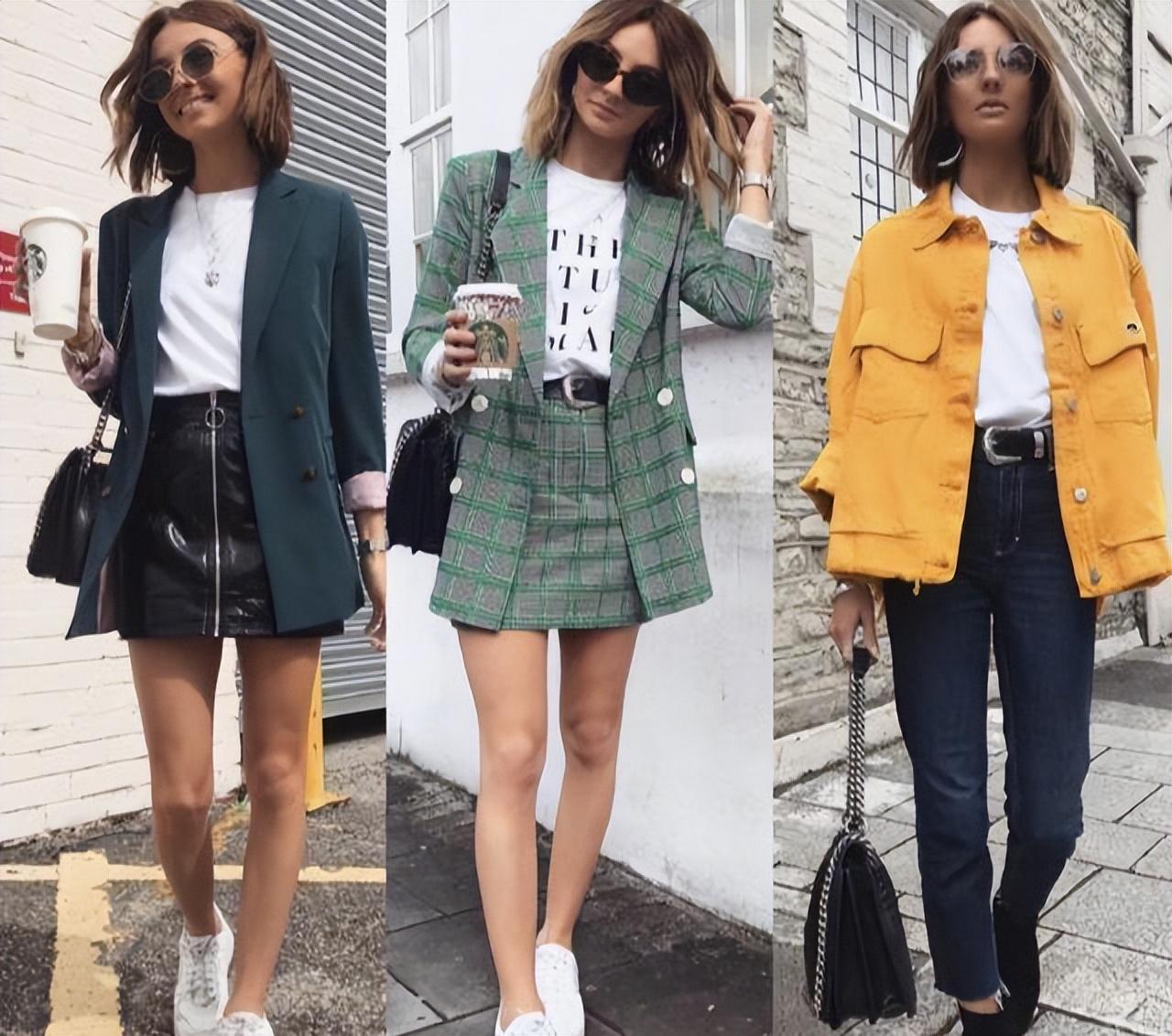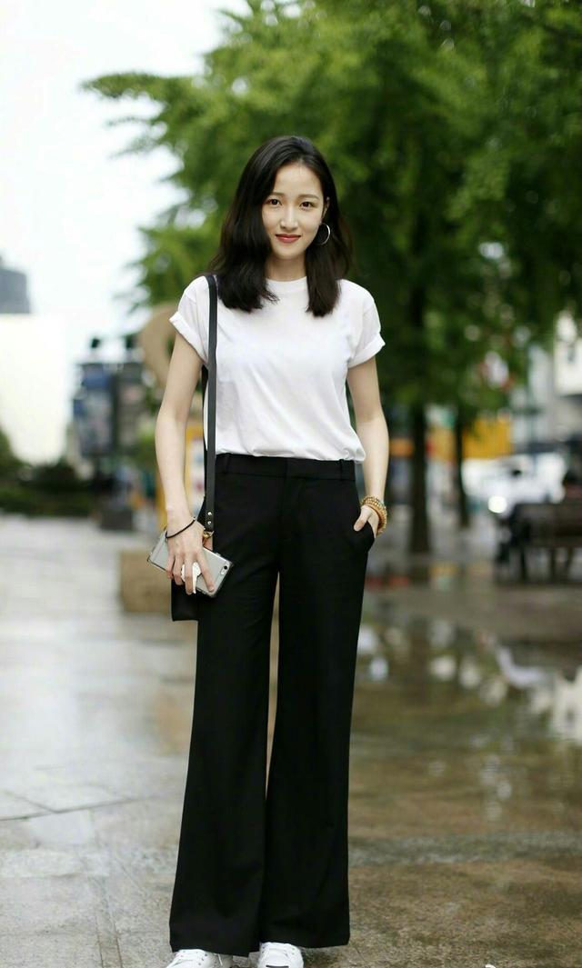 White Pure T-shirts are more common. If you want to add some variety, you can consider solid-color trousers, plus a shawl and other designs. It is simple and yet eye-catching with details. It is super suitable for work.