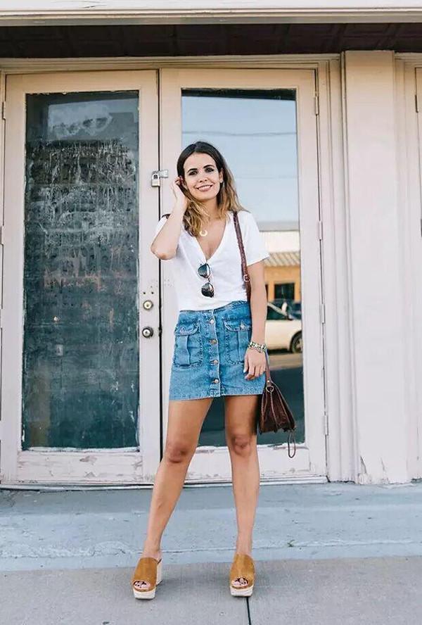 Denim skirts are also indispensable. Denim is classic and will never go out of style. Pair it with a solid-color T-shirt, which is simple and stylish. Wear it with high heels for a full look.