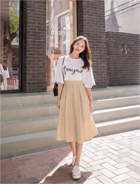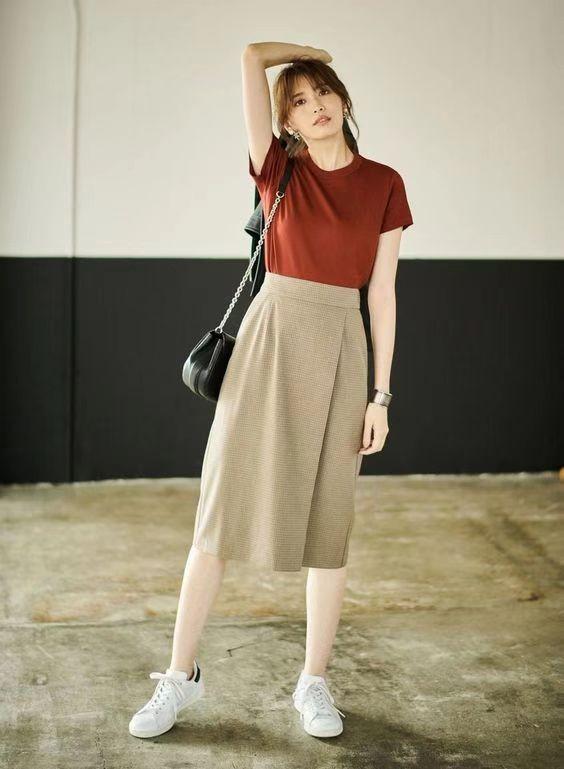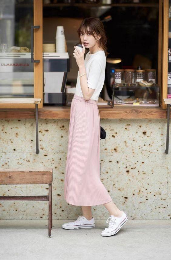 When we wear a skirt, we don’t necessarily have to wear high heels. You can also try this casual, age-reducing style of white shoes, whichNot only is it much more comfortable to wear, it will also make you look more approachable.