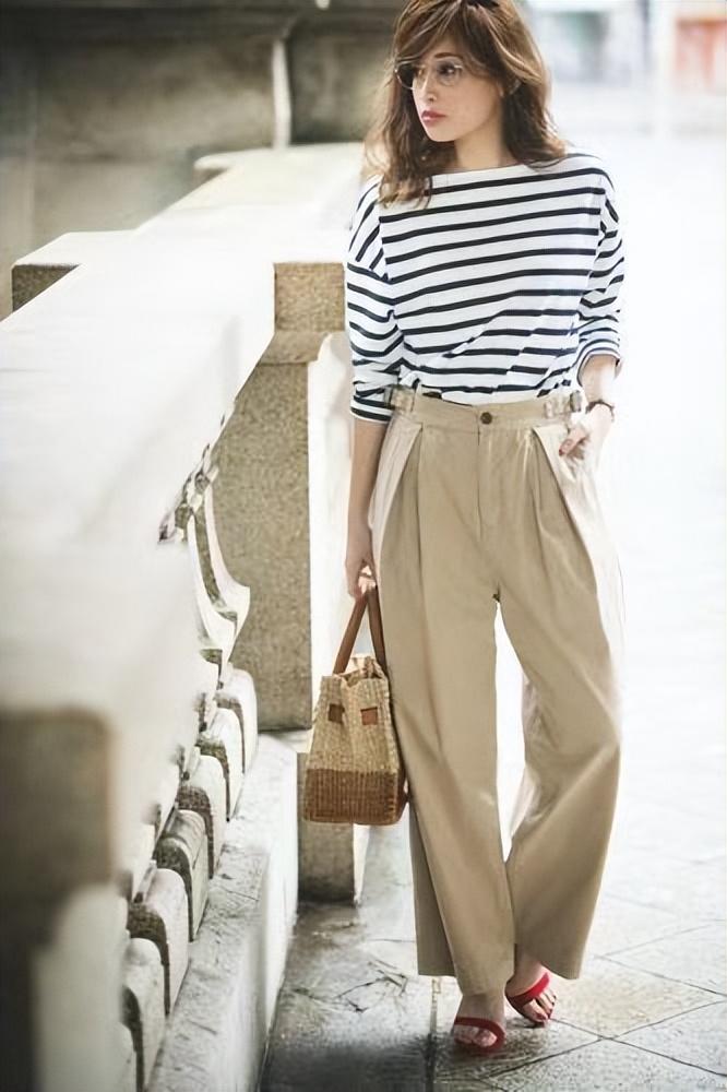 Added regular patterns to the surface of the loose blue and white T-shirt The small striped design gives people a simple and elegant feeling. The lower body is a pair of khaki high-waisted wide-leg pants. The loose pants are good for covering red legs and thick legs. The red strap high heels on the feet. Sandals are lightweight and compact, weakening the heavy feeling brought by wide-leg pants.