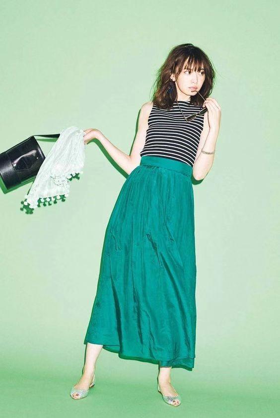 In the following set of styling pictures, a black and white striped vest is used with a lake Blue high-waisted skirt. The skirt is made of high-grade satin material. It looks very noble at first glance. It is paired with a pair of light green open-toe flat shoes. The material underneath makes it look particularly delicate and compact. It perfectly weakens the heavy feeling brought by the wide skirt.