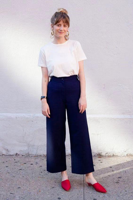 It is recommended that you try wide-leg pants and a T-shirt or a skirt and a T-shirt. These are simple and A practical combination, it is refreshing and comfortable to wear without any heavy feeling. It is very suitable for a 40-year-old middle-aged woman and shows her temperament.