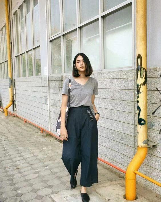 This low-key and calm gray combination uses light gray V With a short-sleeved collar and dark gray high-waisted suit and wide-leg trousers, the overall look is refreshing, elegant and handsome, especially the look of the young lady with one hand in her pocket, which makes her walk with a comfortable aura.