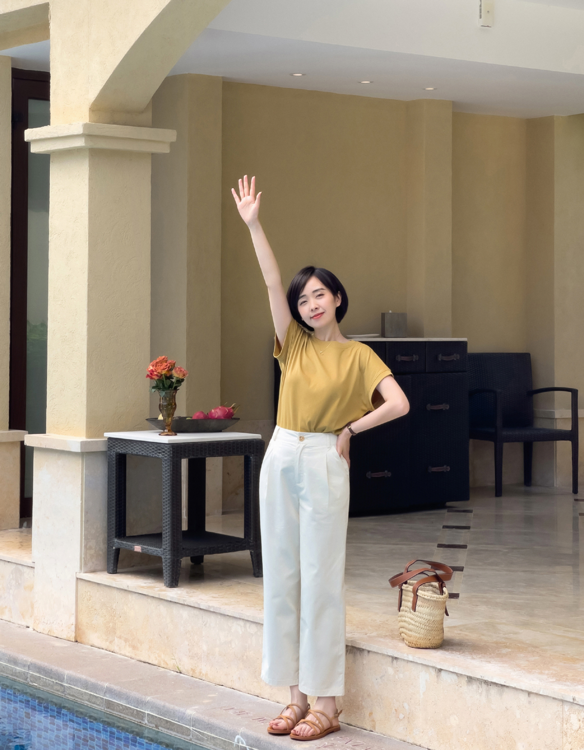 This tight-fitting black T-shirt not only makes the upper body look slimmer, but the close-fitting tailoring also helps outline a petite figure. The lower body is matched with a yellow high-waisted and wide Leg trousers are smart and refreshing. The wide-leg trousers adopt a nine-point design, which will not feel draggy. Paired with duck yellow pointed-toe high heels, it is full of elegance.
