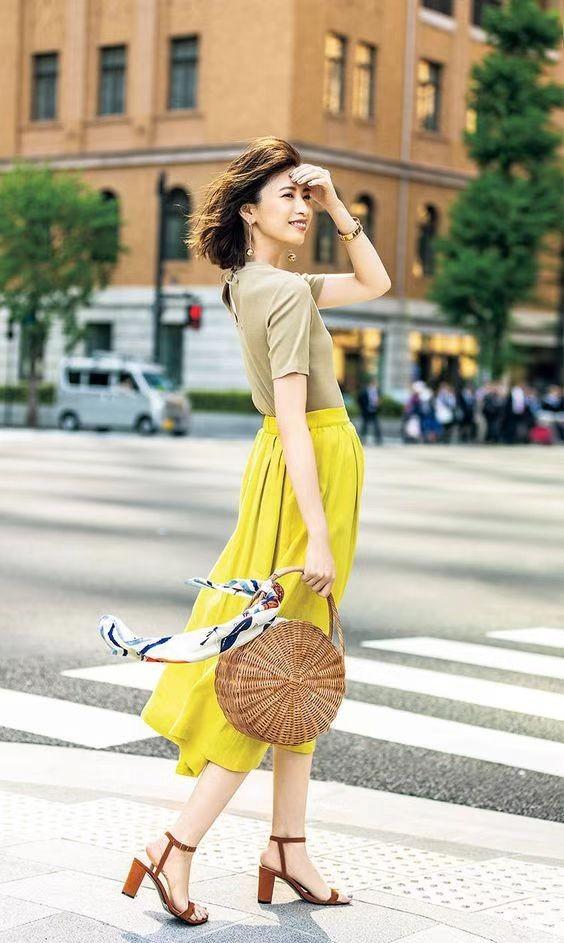 If mature women feel that their clothes are a bit dull in summer, You can boldly choose to match this bright-colored skirt, like this lemon yellow high-waisted skirt, which is particularly eye-catching at first glance. The matching military green short-sleeved upper body makes the overall combination simple and elegant, but also extremely elegant and elegant. Refreshing.