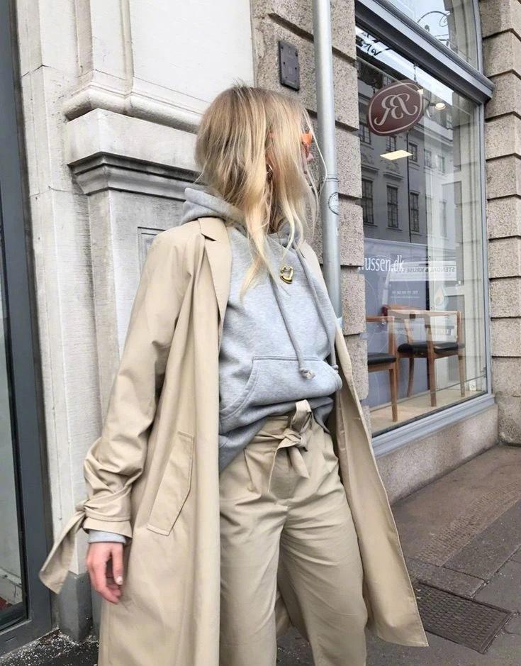 When combined together, it is obvious that the sweatshirt must be the inner wear. This orange-yellow sweatshirt shows different colors. Very bright colors will make your temperament better. We match it with a light gray windbreaker jacket. It is a perfect match when it is dark and bright. It is best to choose the same color as the sweater.