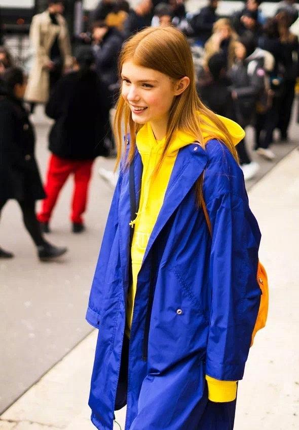 The fluorescent yellow sweatshirt is very flattering because it is loose and unique. At the same time, this color will also show off the skin tone very well. When we combine it with a dark blue windbreaker jacket, we will have a stunning effect that is both negative and positive. Because both are bright colors, strangely they don’t look ugly together.
