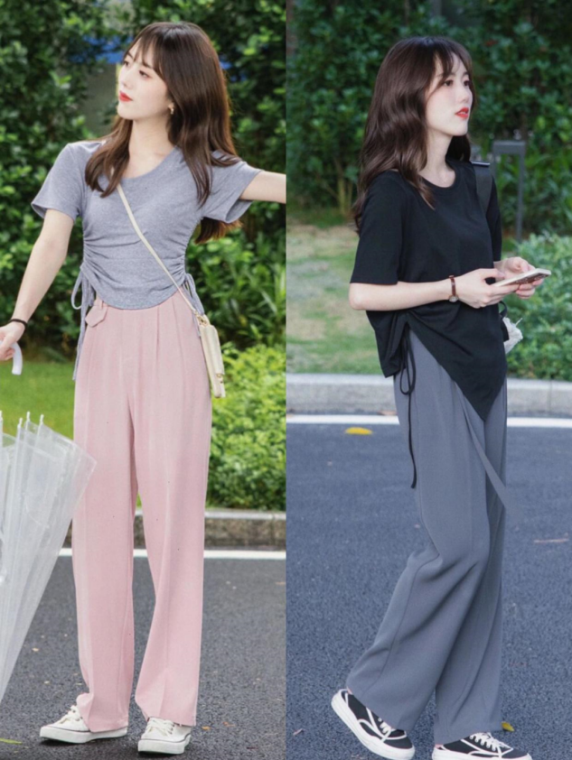 T-shirts with drawstring styles can better fit the body Curves are a very good choice for petite girls. Pairing the lower body with gray suit wide-leg pants or pink cool pants can highlight the proportions of the body that is short at the top and long at the bottom. The whole person looks petite, cute and fresh. Generous.