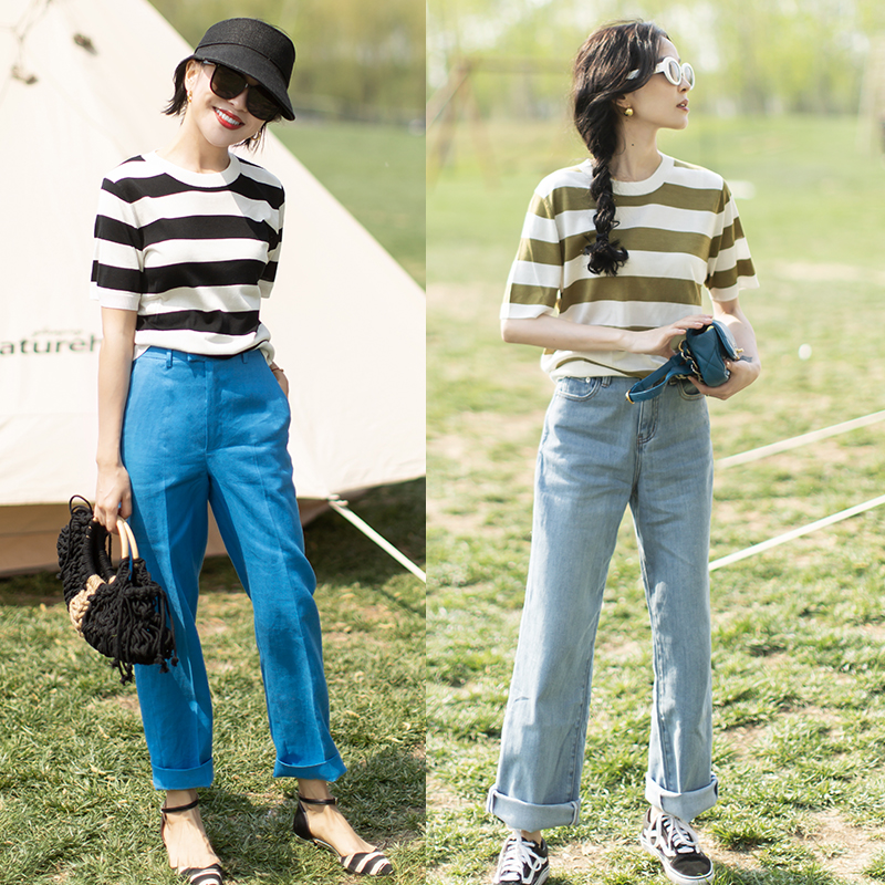 Wide striped T-shirts are very common in summer matching. If you don’t want to look like a bad street outfit, you can use sunglasses, sun hats, handbags and other accessories to weaken the monotony, which will make you look sophisticated and unique.