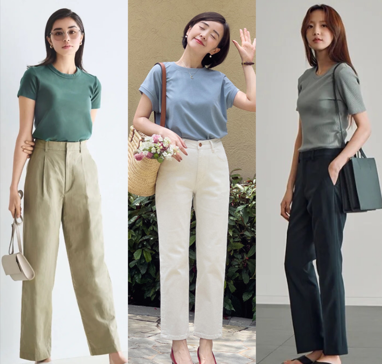 High-waisted pants have the effect of elongating the proportions of the lower body, paired with a T T-shirts can show off your tall figure. T-shirts in colors such as haze blue, gray, and green are not flattering on the upper body, and you can show off your good figure by pairing the lower body with straight pants.