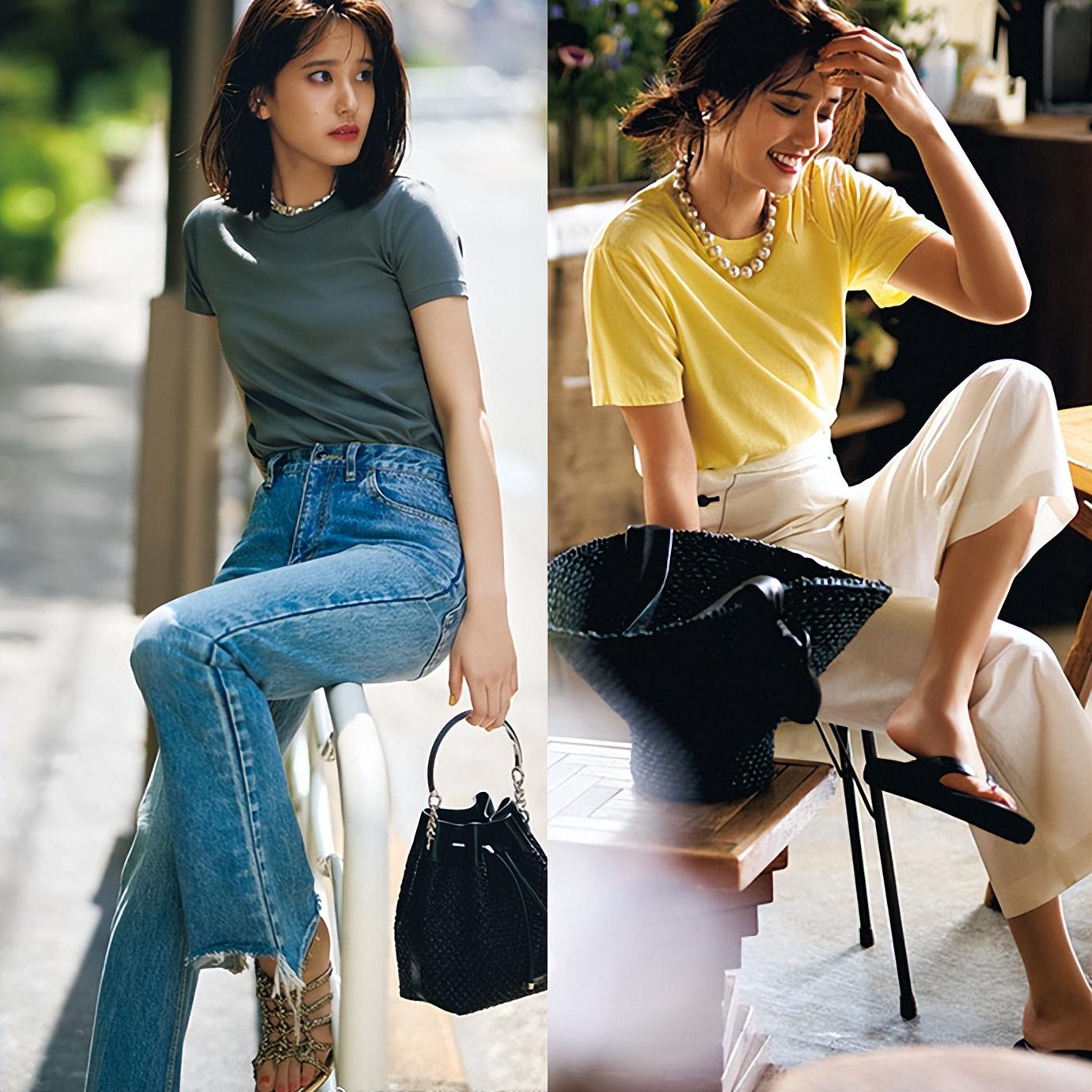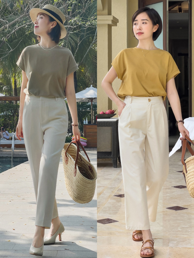 Wear something refreshing and elegant in summer, and your whole temperament will be different. It is recommended that you choose T-shirts with refreshing colors, such as The following two gray-green T-shirts and dead-leaf yellow T-shirts make the upper body look whiter and brighter. The lower body is paired with white high-waisted nine-point pants. The whole person is smart and neat, showing a sassy personality.