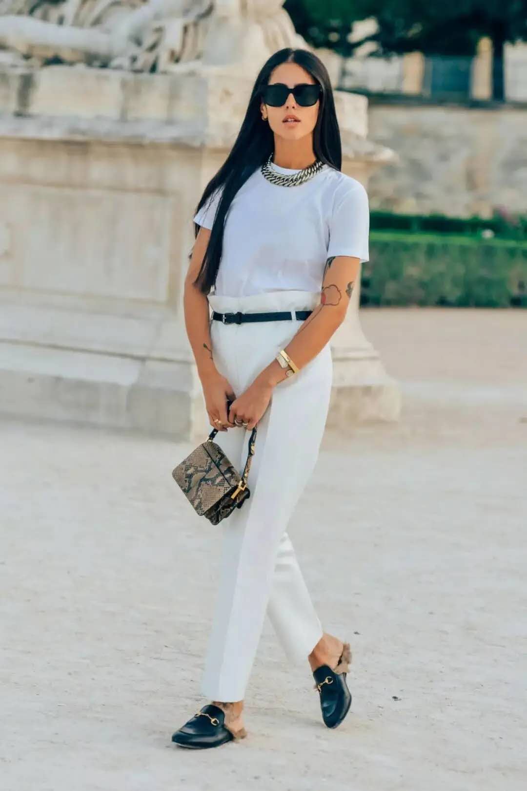 If you want to wear a solid color T-shirt to look more advanced, you can put more thought into the color and choose a bottom that matches the top. The colors are used to match, which shows your temperament. You can also add some small accessories, such as a silk scarf, to add a sense of detail and luxury to your outfit.