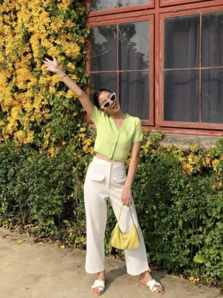 Short T-shirt can be said to look taller.The breasts, especially when combined with high-waisted pants, make the overall proportions instantly look very beautiful. The whole person is tall and thin. Girls with fair skin are recommended to wear short T-shirts with bright colors, which can be paired with a pair of white pants, which is refreshing and eye-catching. If you are worried about appearing dark, you can choose T-shirts such as flesh pink or light khaki that are close to your skin tone and paired with white pants, which are light-colored. The outfit is perfect for summer!