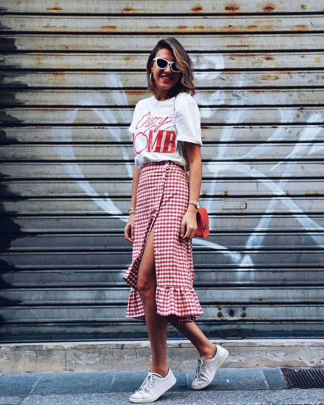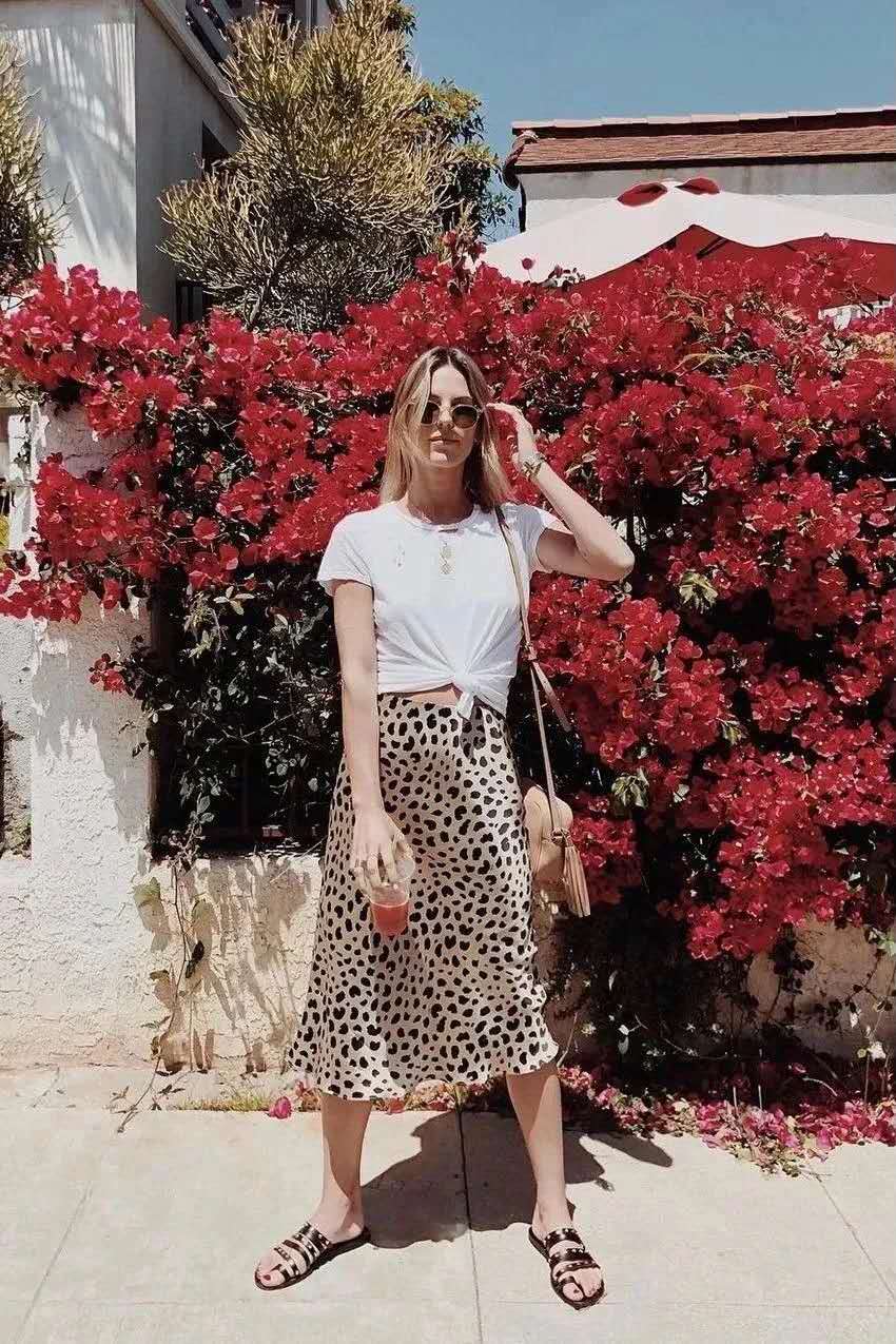 Small-sized printed T-shirts, paired with printed skirts, are a very popular fashion outfit this year, both individual and fashionable. There are also some more conservative girls who don’t dare to wear deep V suspender skirts because they think they are too exposed. However, wearing a printed T-shirt underneath can easily solve this problem and at the same time show a new layering style. Fashion.