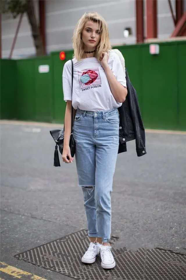 Compared with solid color T-shirts, printed T-shirts can attract others’ attention more easily , while also showing its unique personality. A simple printed T-shirt with letters and flowers is the easiest way to show your style, but if you want to wear a T-shirt with a large area of ​​printing, then the choice of bottoms should be simple.
