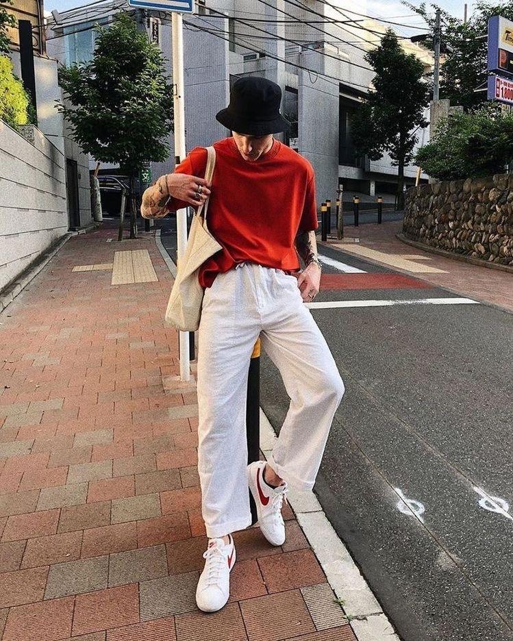 Pairing it with red can highlight the fashion sense, because the neutralization of white pants can make the red look less jumpy. If you still feel that red is too jumpy, you can reduce the jumpiness of red by matching it with some dark accessories. Tuck the T-shirt into your pants and lengthen your leg lines. Of course, you can also switch from red items to bright colors such as yellow, green, purple, etc., and let yourself go crazy in the summer.