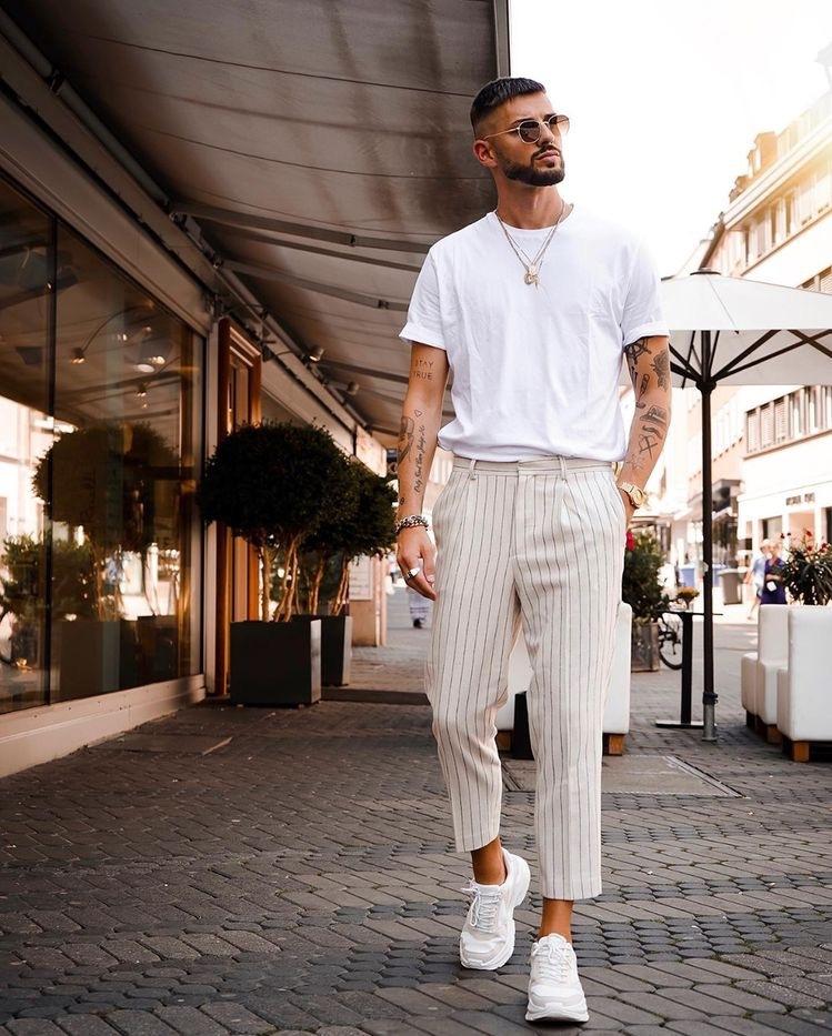 Since white is equivalent to a large reflective plate, although it can make you look whiter, while “reflecting” it will also make your There is a feeling of swelling in the legs, so boys with thick legs should consider it carefully. If you really want to wear white pants, white vertical striped pants will visually extend upwards and make your legs more slender.