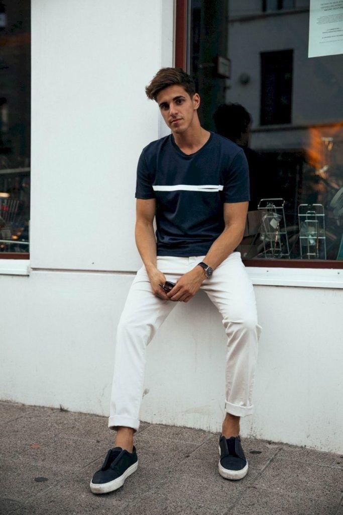 However, it is not recommended to choose a particularly dark blue, as it will make your combination very abrupt and difficult to control. In contrast, if you must choose this type of dark T-shirt, some white pattern embellishments echo the white pants, and the dark T-shirt paired with white pants will not feel out of place.