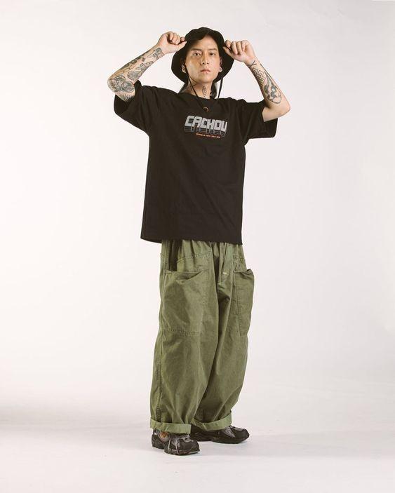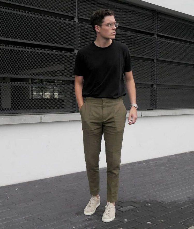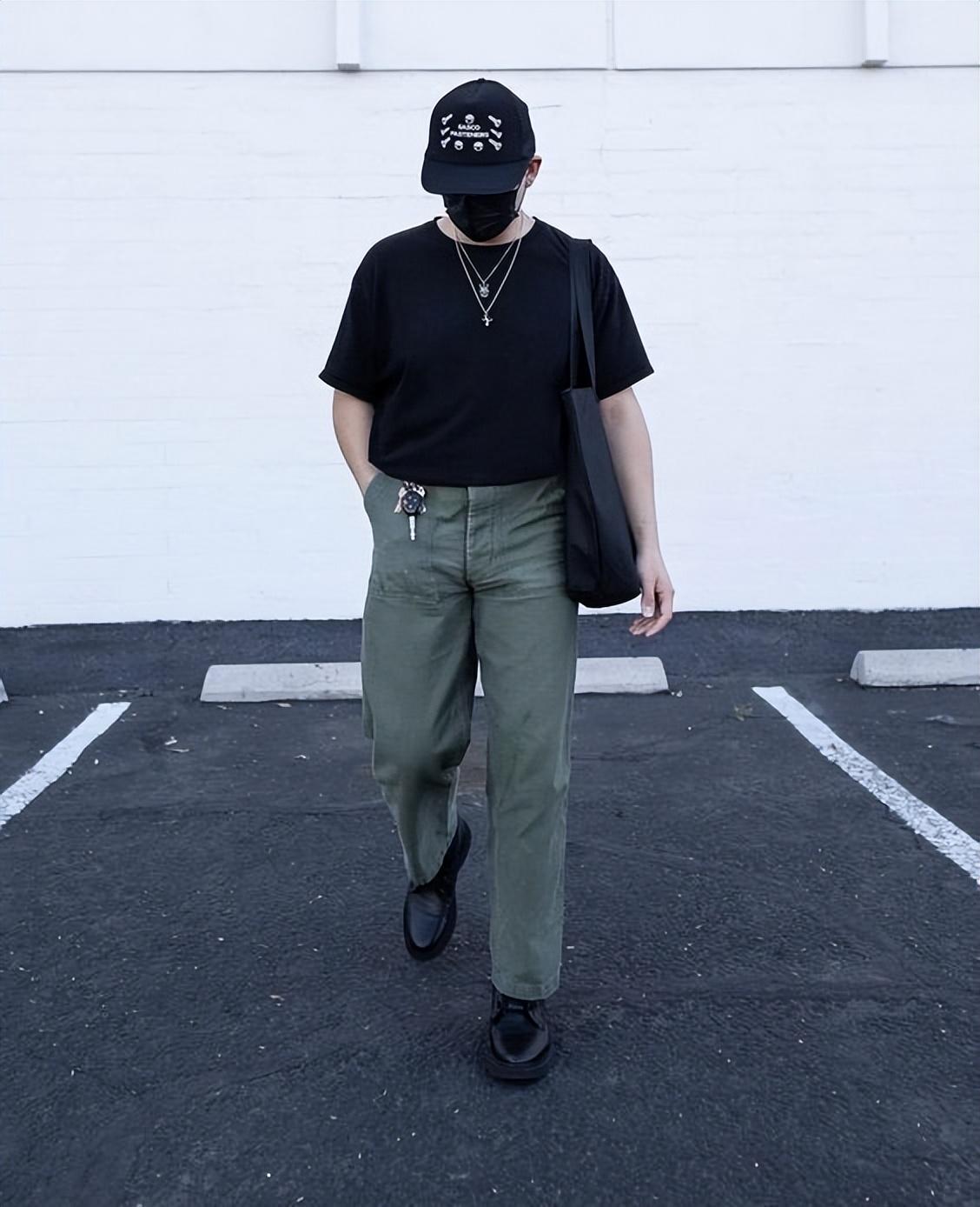 Dark green is suitable for professional trousers, with A well-fitting black T-shirt, medium in size, can modify all aspects of your body shape. Of course, oversize-style military green wide-leg pants are also a very trendy style at the moment and can be worn by most body types.